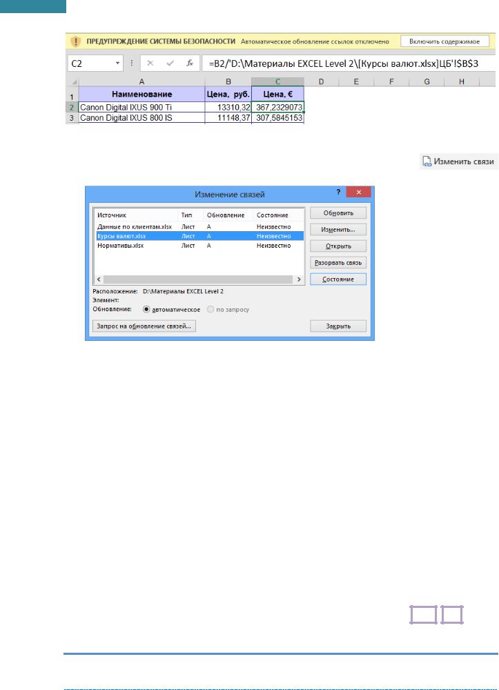 Разорвать связь [Break Link] - разорвать связь с внешним источником. Формулы в ячейках заменяются значениями, которые получены в ячейках на данный момент. Команду отменить нельзя, поэтому следует создать копию файла, чтобы при необходимости остался исходный файл с формулами для последующих обновлений.