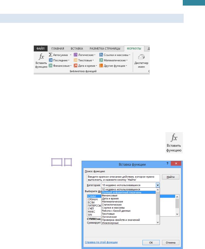 На вкладке Формулы [Formulas], в группе Библиотека функций [Function Library], выбрать Вставить функцию [Insert Function].