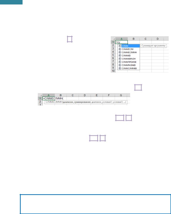 3.Ввести с клавиатуры первые буквы имени функции. Под ячейкой ввода автоматически отображается динамический список наиболее близких по именам функций. Всплывающие подсказки помогают сделать оптимальный выбор.