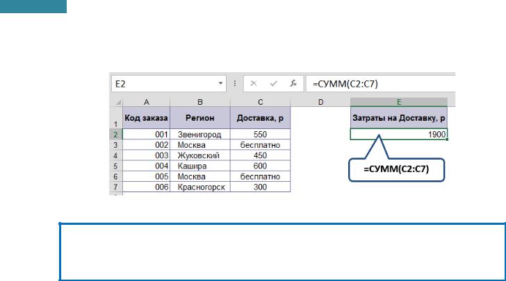 =СУММ(C2:C7) – суммирует из диапазона ячеек C2:C7 только числовые значения.