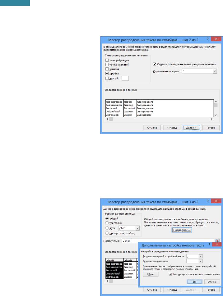 4.На следующем шаге окна Мастер распределения текста по столбцам – шаг 2 из 3 [Convert Text to Columns Wizard – Step 2 of 3] в зависимости от формата исходных данных, выбранных на шаге 1 работы мастера, сделать следующие настройки: