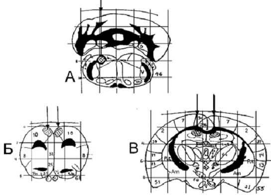 сначала производили коагуляцию исследуемых структур лимбической системы, а
