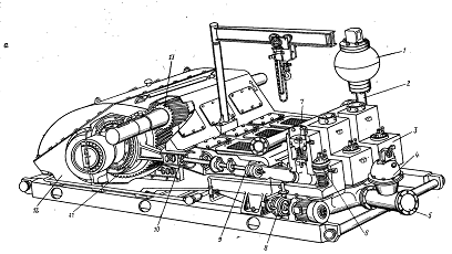 - пневмокомпенсатор, 2 - выходной коллектор, 3 - гидравлическая коробка, 4 - компенсатор всасывающий, 5 - коллектор входной, 6,7 - клапаны всасывающий и нагнетательный, 8 - насос смазочный, 9 - поршень с штоком, 10 - ползун, 11 - вал коренной с шатунами, 12 - станина, 13 - трансмиссионный вал