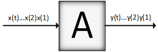 На такие устройства в последовательные дискретные моменты времени 1,2, ..., t, t+1,... поступают входные сигналы x(1),x(2), ..., x(t),x(t+1),... и в ответ на них автомат A вырабатывает выходные сигналы y(1) y(2), ..., y(t), y(t+1),.... Конечные автоматы характеризуются двумя особенностями: