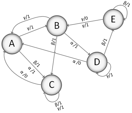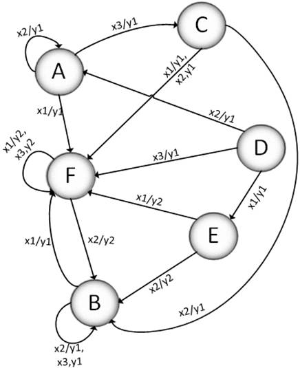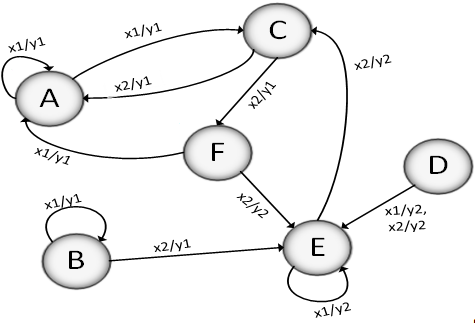 состояния и выходы с помощью вершин графа, а переходы - с помощью рёбер.