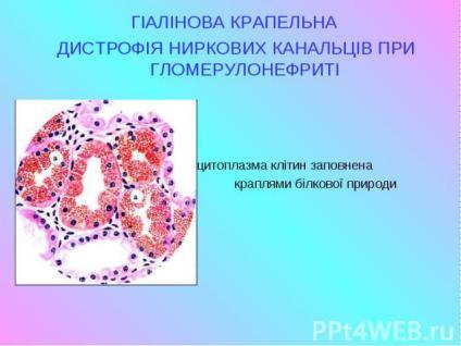 Гіаліново-крапельна дистрофія. Характеризується утворенням у цитоплазмі великих гіаліноподібних білкових крапель, які зливаються між собою, заповнюючи цитоплазму клітини. Найчастіше зустрічається в нирках рідко – в печінці, інших залозистих органах, а в поодиноких випадках – у м’язовій тканині (особливо в міокарді). У зв’язку з безповоротною денатурацією цитоплазматичного білку вона необоротна й закінчується коагуляційним некрозом клітини. Клінічно характеризується різко вираженою недостатністю органу.