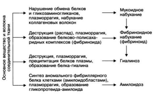 Причини: мукоїдне, фібріноідне набухання і гіаліноз: інфекційно-алергі-