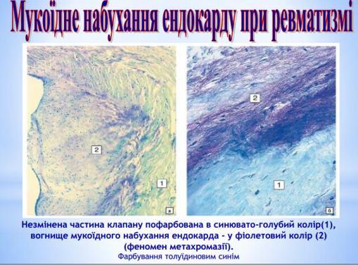 Виникає феномен метахромазії, в основі якого лежить зміна стану основної проміжної речовини з накопиченням хромотропних речовин.