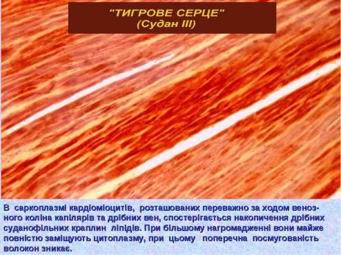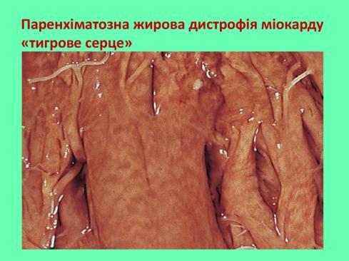 - Хронічні гіпоксичні стани, особливо при вираженій анемії. При хронічній жировій дистрофії жовті смуги чергуються з червоно-коричневими ділянками («тигрове серце»). Клінічні ознаки в основному не дуже виражені.