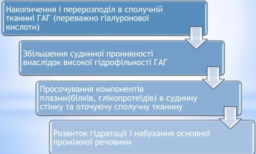 Глікозаміноглікани мають гідрофільні властивості, і накопичення їх обумовлює підвищення тканинної та судинної проникності.