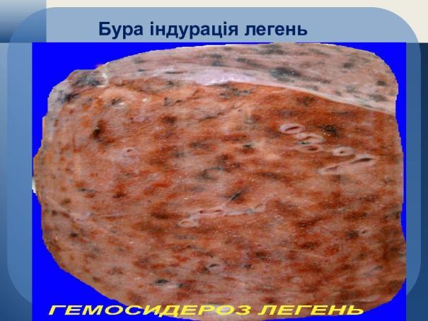 Легені збільшені за об’ємом, ущільнені, на поверхні розрізу виявляється дифузна плямистість бурого кольору. Особливості патологічного процесу: відноситься до категорії змішаних дистрофій із порушенням гемоглобіногенних пігментів, спостерігається при хронічному венозному повнокров′ї легень внаслідок хронічної серцевої недостатності за лівошлуночковим типом, характеризується відкладенням гемосидерину в цитоплазмі сидеробластів («клітин серцевих вад»)