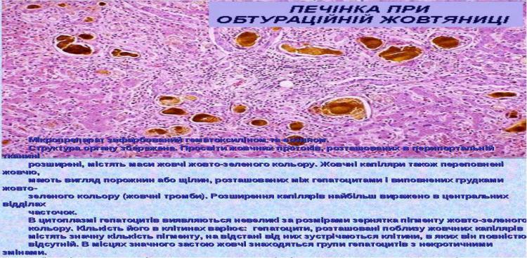 Мікропрепарат зафарбований гематоксиліном та еозином. Структура органу збережена. Просвіти жовчних протоків, розташованих в перипортальній тканині розширені, містять маси жовчі жовто-зеленого кольору. Жовчні капіляри також переповнені жовчю, мають вигляд порожнин або щілин, розташованих між гепатоцитами і виповнених грудками жовто- зеленого кольору (жовчні тромби). Розширення капілярів найбільш виражено в центральних відділах часточок. В цитоплазмі гепатоцитів виявляються невеликі за розмірами зернятка пігменту жовто-зеленого кольору. Кількість його в клітинах варіює: гепатоцити, розташовані поблизу жовчних капілярів містять значну кількість пігменту, на відстані від них зустрічаються клітини, в яких він повністю відсутній. В місцях значного застою жовчі знаходяться групи гепатоцитів з некротичними змінами. Найчастіше це спостерігається в центральних відділах часточок. Некроз гепатоцитів супроводжу- ється появою лейкоцитів в просвітах кровоносних капілярів.