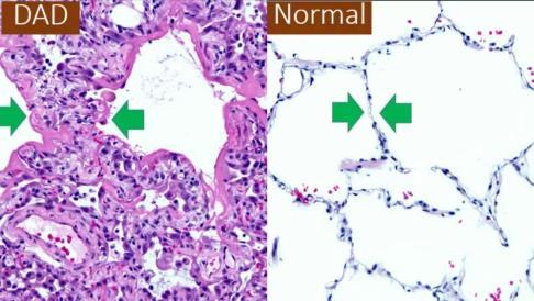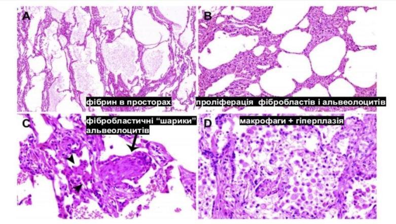 COVID-19 перебігає як інтерстиційна пневмонія (запалення інтерстицію). Часте ускладнення - тяжкий гострий респіраторний синдром (SARS), що характеризується дифузним пошкодженням альвеол (DAD, diffuse alveolar damage) із ознаками ГРДС.