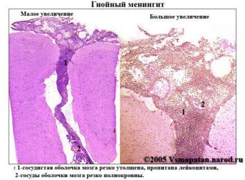 -За гнійного менінгіту уражуються м’які мозкові оболонки, які з першої доби стають різко гіперемійованими, просочені серозним ексудатом. До початку 3-ї доби в ексудаті з’являється велика кількість нейтрофільних лейкоцитів і ексудат набуває гнійного вигляду.