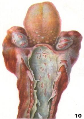 зів та мигдалики (слизова оболонка повнокровна, набрякла, вкрита жовтувато-білими плівками. Верхні шари епітелію некротизовані, слизова оболонка просочена фібринозним ексудатом з домішкою лейкоцитів)