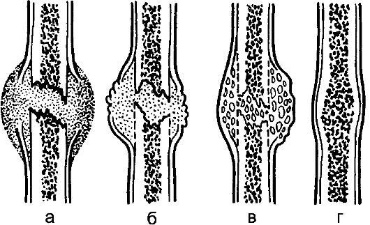Этапы формирования костной мозоли: а - гематома при переломы, разташована між кістковими відламками; б - грануляційна мозоль; в - фиброзно-кісткова (фиброзно-хрящовая) мозоль; г – кінцева кісткова мозоль