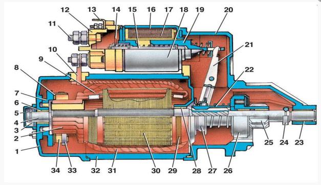 Стартер 421.3708: 1 – крышка со стороны коллектора; 2 – коллектор; 3 – стопорная шайба; 4 – вал якоря; 5 – колпак; 6, 23, 28 – втулка (подшипник); 7 – траверса; 8 – щеткодержатель щетки отрицательного вывода; 9 – обмотка якоря стартера; 10 – вывод обмотки возбуждения;11 – контактный болт; 12 – крышка реле; 13 – контакт реле; 14 – контактная пластина; 15 – стержень якоря; 16 – втягивающая обмотка; 17 – удерживающая обмотка; 18 – тяговое реле; 19 – якорь реле; 20 – крышка со стороны привода; 21 – рычаг включения шестерни привода; 22 – шлицевая втулка; 24 – упорное кольцо; 25 – шестерня привода маховика коленчатого вала; 26 – привод; 27 – центрирующий диск; 29 – бандажное кольцо; 30 – якорь стартера; 31 – катушка обмотки возбуждения; 32 – корпус стартера; 33 – пружина щетки; 34 – щеткодержатель щетки положительного вывода