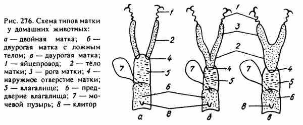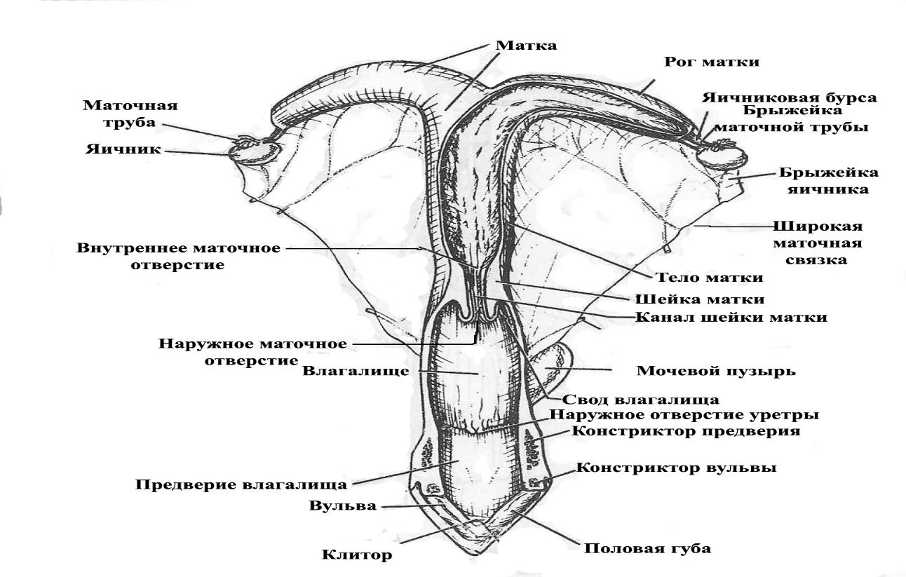Яичники. Они состоят из соединительнотканного остова и паренхимы; покрыты белочной оболочкой, поверхность которой выстлана зачатковым эпителием. У коровы и овцы яичники овальной формы размером соответственно 2-5 х 1,2 см и 0,5-1х0,3-0,5 см, у свиньи – округлые – 5 х 2 см, у кобылы бобовидные с углублением (овуляционная ямка) – 10 х 5 см. Яйцепроводы. Тонкие извитые трубки, образующие около яичника воронку и бахрому. Стенка состоит из слизистой (мерцательный эпителий), мышечной и серозной оболочек. У коровы их длина 25-28 см, овцы-6, свиньи-30, у кобылы-30 см. Матка. Полый мышечный орган трубчатыми разветвленными железами в слизистой оболочке. Парные рога матки у коровы длиной 25 см, овцы – 12, у свиньи – до 2м, у лошади 25 см. Длина тела матки у коровы и овцы примерно 3 – 5 см, свиньи – 5 – 12, кобылы – 15 см. Шейка матки у коровы – 10 см, овцы – 6, свиньи – 20см, у кобылы-8см. Влагалище. У коровы длина влагалища 38 см, овцы – 12, свиньи - 18, кобылы – 30 см.