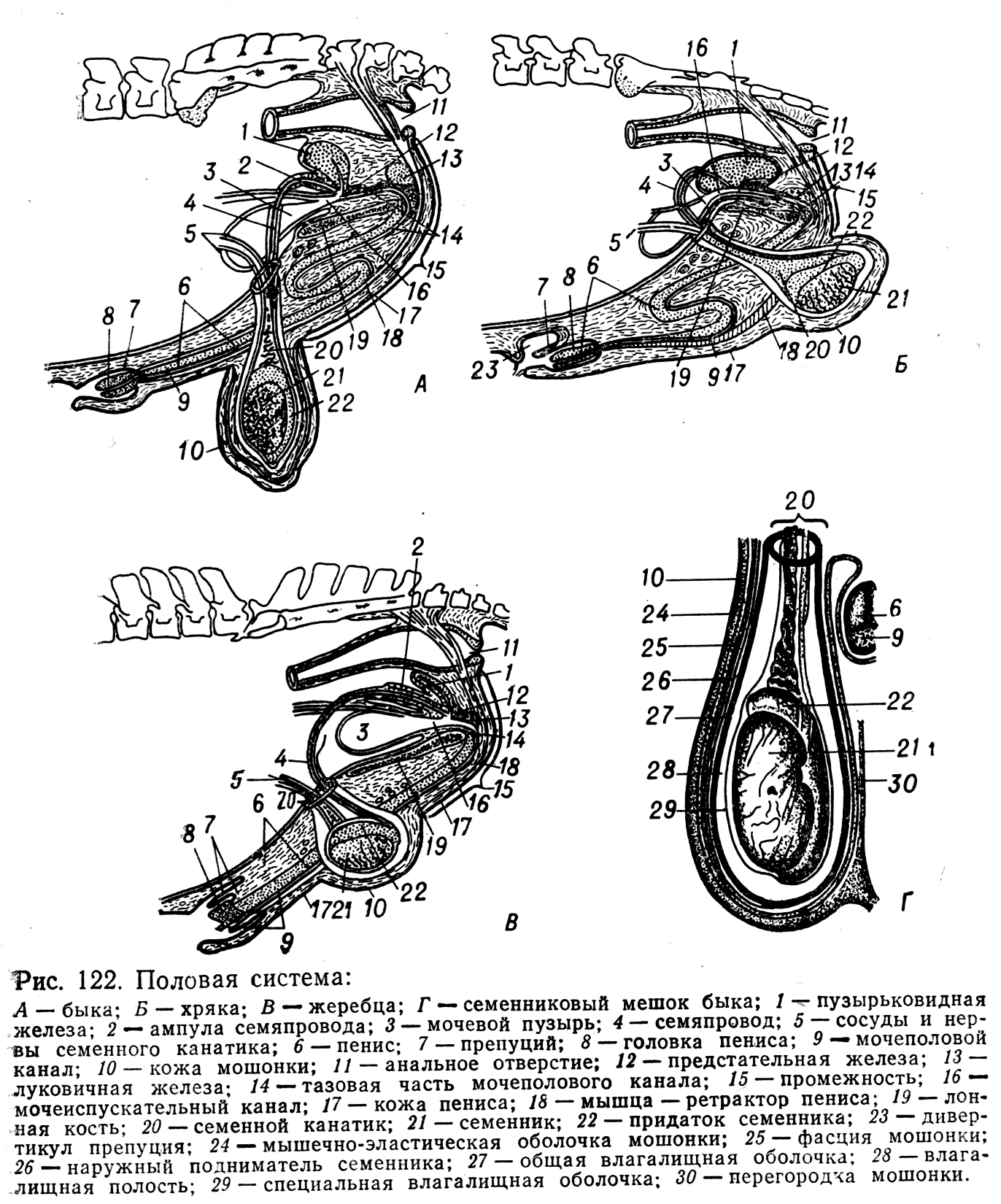 Семенники – парные органы овальной или округлой формы. Например, у быков их длина около 15 см, толщина-7см, масса 300г. Соединительнотканные перегородки разделяют семенник на множество долек пирамидальной формы. В каждой дольки располагается 4-5 извитых канальцев, которые направляются к центру семенника, сливаются и впадают в прямые канальцы. Прямые канальцы в области головки придатка формируют сеть семенника, от которой отходят 10-30 сильно извитых спермиовыносящих канальцев. Спермиовыносящие канальцы сливаются в один общий извитой проток придатка, которой переходит в спермиопровод. Длина извитых канальцев у быка около 500м. Поверхность сперматогенного эпителия канальцев 2м2. Придаток из головки, тела и хвоста. Просвет канала придатка в начале 0,1-0,2 мм, а в конце 1-2мм. Длина канала у жеребца 86м, у быка 30м. Над мочевым пузырем перед впадением в мочевой канал спермиопроводы образуют расширения – ампулы спермиопроводов (хорошо развиты у быка, барана, козла, жеребца). Перед впадением в мочеполовой канал оба спермиопровода сливаются в общий эякуляторный проток.
