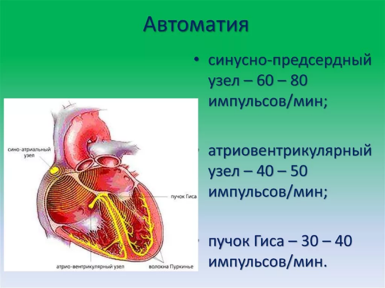 Особенность проводящей системы сердца заключается в способности генерировать возбуждение. В обычных условиях в более частом ритме импульсы генерируются в синоатриальном узле, распространяются на предсердия, атриовентрикулярный узел, предсердно-желудочковый пучок, сердечные волокна, мышцу желудочков, обеспечивая последовательное сокращение предсердий и желудочков.