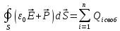 Поток вектора электрического смещения через произвольную замкнутую поверхность равен алгебраической сумме свободных зарядов, охваченных этой поверхностью: