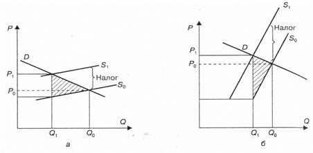 неэластичном (б) спросе: D - спрос; S0, S1, - предложение до и после введения налога [Л1, с.