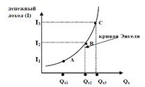 На рисунке 5 графически изображена кривая Энгеля для нормального товара. Точки А, В и С соответствуют точкам равновесия Е1, Е2 и Е3, перенесенным с графика кривой «доход - потребление». Путем соединения всех точек, соответствующих различному доходу и связанному с ним равновесному объему покупок товара Х получается Кривая Энгеля.