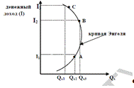 На рисунке 6, в виде графика, представлена кривая Энгеля для инфериорного блага (товара низкого качества). Как видно из графика, первоначально, при низких уровнях дохода, потребитель увеличивал спрос на первое благо с увеличением дохода, то есть сначала оно было нормальным. Но, начиная с некоторого уровня дохода потребитель сокращает потребление первого блага и тратит свой возросший доход на наиболее ценные, с точки зрения покупателя, товары и работы (услуги).