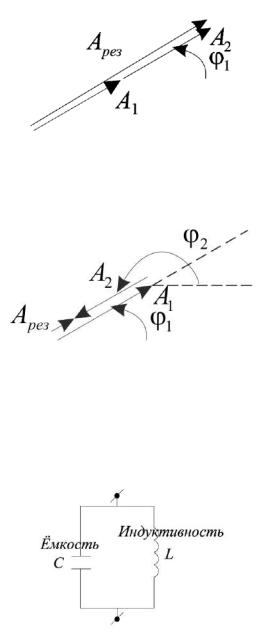 2) Условие min амплитуды реализуется, если φ1=π+φ2 (точнее φ1−φ2=π+2π∙n, n − целое число). В этом случае А=А1-А2 – получим в сумме минимальную амплитуду результирующего колебания (см. рис. 6.9). Поэтому