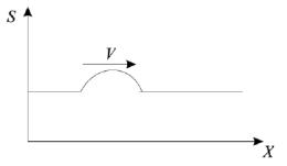 Рассмотрим горизонтально натянутый резиновый жгут (см. рис.7.4.). Если начало жгута возмутить, резко сместив вверх-вниз по закону S1(t), где S1 − отклонение по вертикали, t − время, то вдоль жгута побежит волна с некоторой скоростью V. Это означает, что движение точек жгута будет аналогично движению начала жгута, но с задержкой по времени t=x/V, где х − положение рассматриваемой точки жгута.