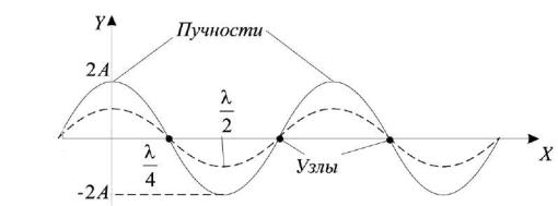 пучностях cos(2π∙x/λ)=1, координаты пучности x=n∙λ/2, где n − целое число. Если волна отражается от границы с более плотной средой, то в
