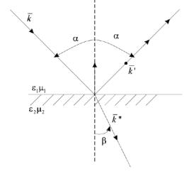 Закон отражения заключается в том, что угол падения α, между падающим лучом k и нормалью к плоскости раздела, равен углу отражения (между нормалью и вектором k/, см. рис. 8.4).