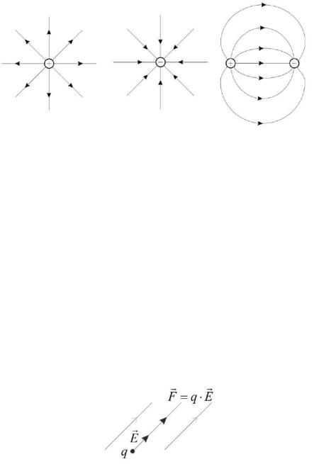 Условились, что чем больше напряженность поля Е, тем гуще изображаются силовые линии. (Силовых линий в природе нет, т.е. их рисуют для наглядности). Силовые линии начинаются на положительных зарядах, а заканчиваются на отрицательных или на бесконечности. (см. рис. 1.3).