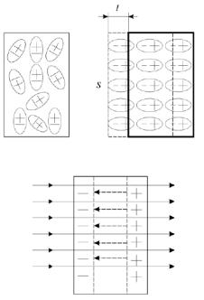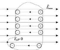 Электроны начнут двигаться против поля, накапливаясь у поверхности. Положительные заряды окажутся в другой стороне. При этом каждая пара, положительная и отрицательная создает свое внутреннее поле, которое частично компенсирует внешнее. На рис.3.1 это поле показано пунктиром.