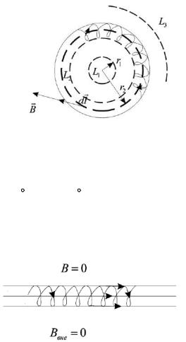 Для поля вне тороида (контуров L1 и L2) по теореме о циркуляции получаем: