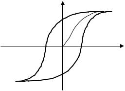 Несколько иначе происходит намагничивание ферромагнетиков. Как показали опыты А.Г. Столетова (1872 г.), их намагниченность зависит от Н сложным образом. Типичная зависимость J от Н для изначально не намагниченного образца показана на рисунке 5.8а. Это так называемая, основная кривая намагничивания. По мере возрастания Н намагниченность J сначала растет быстро (и нелинейно), затем медленнее и, наконец, достигается магнитное насыщение, значение J уже не зависит от напряженности H.
