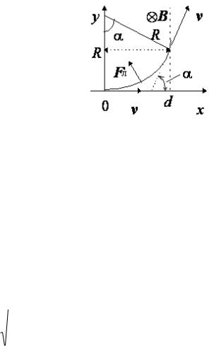 Пусть область магнитного поля имеет толщину d вдоль оси x и скорость протона v при входе в область поля также направлена вдоль оси x, как показано на рисунке. Траектория движения протона в области магнитного поля представляет собой дугу окружности, вследствие чего вектор скорости протона на выходе из поля отклонится на угол от первоначального направ-