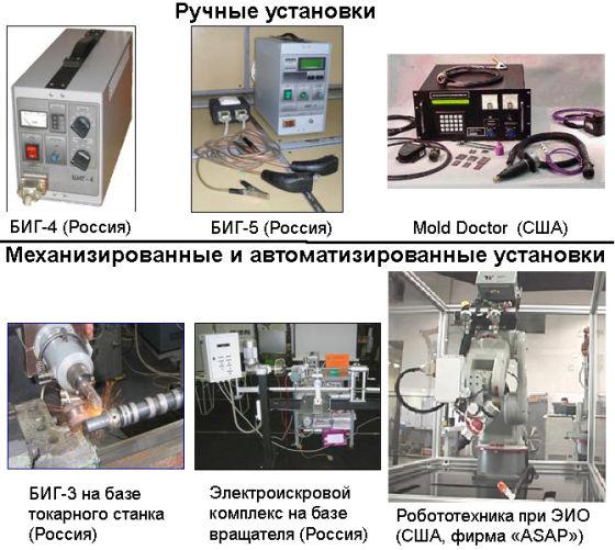 Процесс ЭИО реализуется с помощью установок, которые в зависимости от конструкции позволяют наносить покрытия в ручном, механизированном или автоматизированном режимах. Это широкий класс оборудования разных наименований, моделей, технических характеристик и стоимости. Его выпускают и эффективно используют во многих технически развитых странах мира (4). На рис. 3 приведены из многочисленного ряда некоторые примеры современного отечественного и зарубежного ЭИ оборудования. Дальнейшее совершенствование его в значительной мере связано с оптимизацией параметров и обеспечением энергетической стабильности искровых импульсов, зависящей как от генераторов установок, так и электродных инструментов.