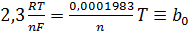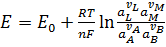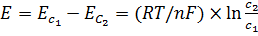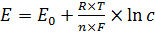 Где Е0 - электрическая постоянная, зависящая от выбора электрода сравнения, R - газовая постоянная, равная 8,32 Дж/граджмоль, Т - абсолютная температура, n - степень окисления металла в данном соединении (в соответствии с теорией строения атома - число электронов, которое теряет атом металла, превращаясь в ион), F - число Фарадея, с - молярная концентрация ионов металла в данном растворе.[2],[3]