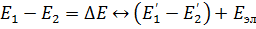 где E1, E2, и E’1, E’2 - «энергия» веществ, контактирующих в элекрохимической системе, соответственно до и после процесса взаимодействия, Eэл - величина электрической энергии, возникающей в системе, E - количество энергии, передаваемой от вещества 1 к веществу 2 в электрохимическом процессе.