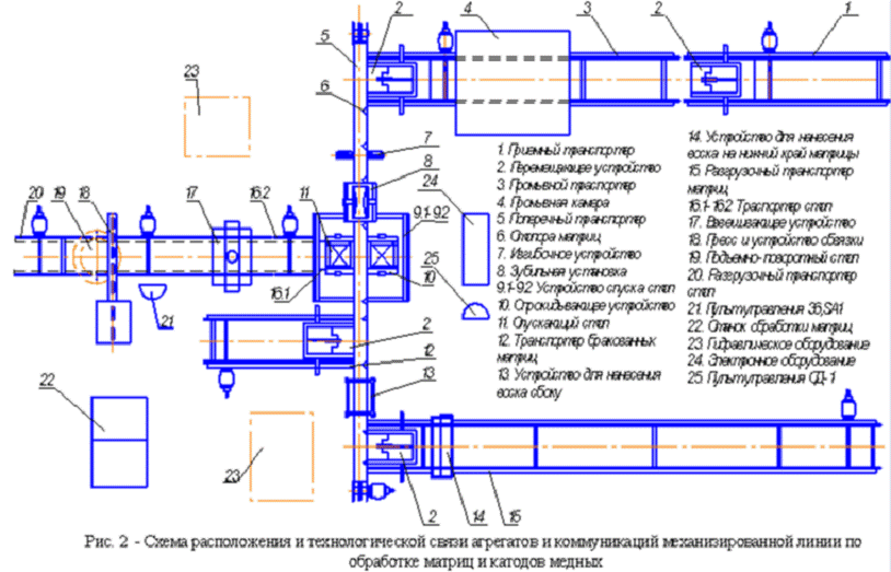 Приемный транспортер доставляет матрицы с катодным осадком в промывочную камеру, где происходит трехстадийная промывка катодов от остатков электролита и воска с нижних и боковых кромок матриц. После промывки матрицы с нарощенной медью направляют на узел сдирки, где на первой стадии путем изгиба матриц происходит локальное, а затем, на второй стадии при помощи ножей, полное отделение медных осадков от матрицы. Катоды формируют в стопы на очередных станциях стрип-машины - опрокидывающих и опускающих вилах. Взвешивают на вмонтированный в транспортер стрип-машины весах, и направляют на станцию упаковки. Упаковку производят на прессе и обвязочном устройстве стрип-машины. Пакеты катодов обвязывают стальной упаковочной лентой. Вывоз пакетов из отделения осуществляется железнодорожным или автомобильным транспортом.