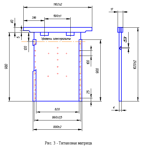 На ЗАО "Кыштымский медеэлектролитный завод" медный осадок наращивают на матрицах из титана ВТ1-0 ГОСТ 19807-91; размер рабочей поверхности 1000 * 860 мм; обрамление матриц - полипропилен ТУ 2211-015-00203521; масса 24 кг. Токоподвод (катодная штанга) выполнен из биметалла "титан-медь", изготовленного сваркой взрывом. Кромки матрицы перед завешиванием в ванну изолируют воском. С целью повышения производительности труда и надежности в процессе эксплуатации таких матриц путем исключения самосъема осадков меди (от изменения температуры, например, при промывке) полотно матрицы снабжено дополнительно одним или несколькими отверстиями.