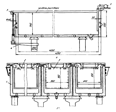При меньшем зазоре ухудшается циркуляция электролита, затрудняется замена электродов; превышение этого расстояния приводит к бесполезному увеличению размера ванн. Глубина ванн должна быть достаточной для того, чтобы шлам, образующийся при растворении анодов, мог отстаиваться при оптимальной скорости циркуляции электролита. Для этого необходимо, чтобы расстояние между нижними краями катодов и дном составляло 180-200 мм.