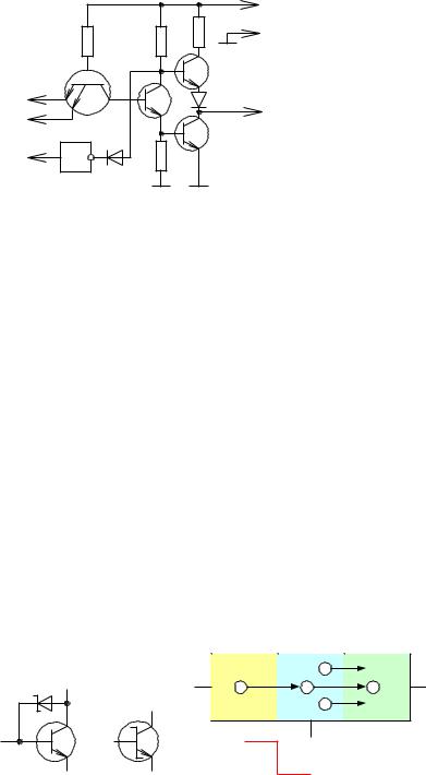 Кодному из недостатков ТТЛ можно отнести сравнительно невысокое быстродействие. Это объясняется тем, что при переключении транзистора из режима насыщения в режим отсечки база транзистора оказывается насыщенной неосновными носителями заряда. И коллекторный ток транзистора будет продолжать течь до тех пор, пока неосновные носители заряда не перейдут из базы в коллектор. Для повышения быстродействия в ТТЛШ между базой и коллектором транзистора включают быстродействующий переход Шоттки. В этом случае неосновные носители будут переходить из базы в коллектор не через коллекторный p-n переход, а через переход Шоттки (смотрите Рис. 192).