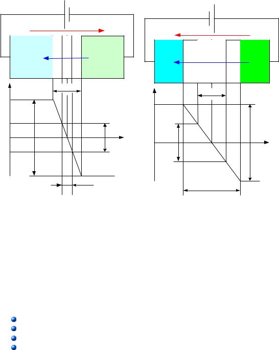 Такое включение p-n перехода называется прямым, и ток через p-n переход, вызванный основными носителями заряда, также называется прямым током. Считается, что при прямом включении p-n переход открыт. Если подключить внешнее напряжение минусом на p-область, а плюсом на n-область, то возникает внешнее электрическое поле, линии напряжённости которого совпадают с внутренним полем p-n перехода. В результате это приведёт к увеличению потенциального барьера и ширины p-n перехода. Основные носители заряда не смогут преодолеть p-n переход, и считается, что p-n переход закрыт. Оба поля – и внутреннее и внешнее - являются ускоряющими для неосновных носителей заряда, поэтому неосновные носители заряда будут проходить через p-n переход, образуя очень маленький ток, который называется обратным током. Такое включение p-n перехода также называется обратным.