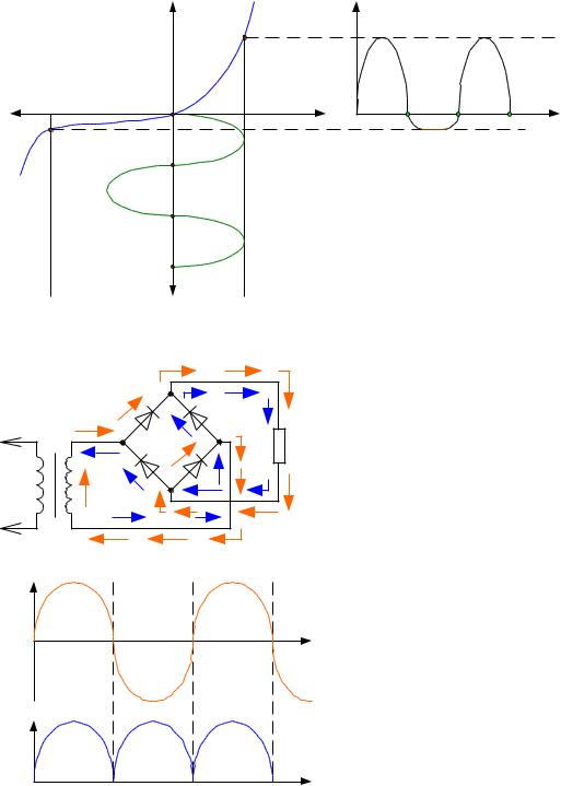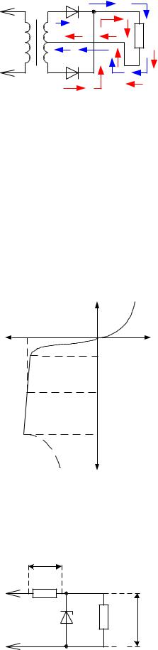 2) Включение выпрямительных диодов в схемах выпрямителей. Диоды в схемах выпрямителей включаются по одно- и двухполупериодной схемам. Если взять один диод, то ток в нагрузке будет протекать за одну половину периода, поэтому такой выпрямитель называется однополупериодным. Его недостаток – малый КПД.