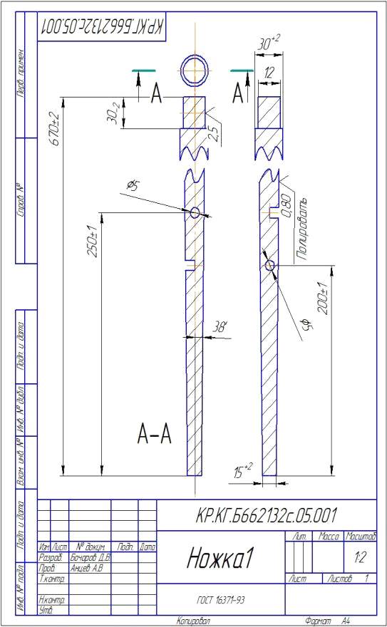 Создаем ножку2. Для этого я нарисовал эскиз детали, проставил размеры и применил к нему операцию вращения, сделал отверстия под поперечные. Далее создаем чертеж с допусками и шероховатостями.