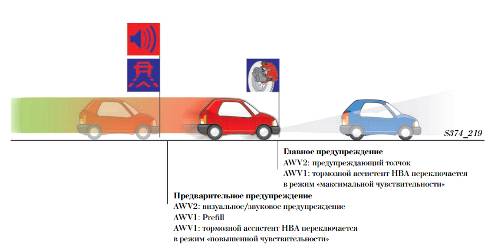 Предварительное предупреждение. При предварительном предупреждении сначала в комбинации приборов отображается предупреждающий символ (дополнительно может раздаваться акустический сигнал). Одновременно с этим в тормозной системе предварительно повышается давление (Prefill), а гидравлический тормозной ассистент (HBA) переключается в режим «повышенной чувствительности».
