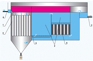 электрофлотатор, 6 - сточная вода, 7 - очищенная вода)