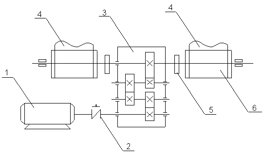 Рисунок 1. - Кинематическая схема сдвоенного конвейера: 1 - двигатель; 2 - тормоз; 3 - редуктор; 4 - лента; 5 - муфта; 6 - барабан.